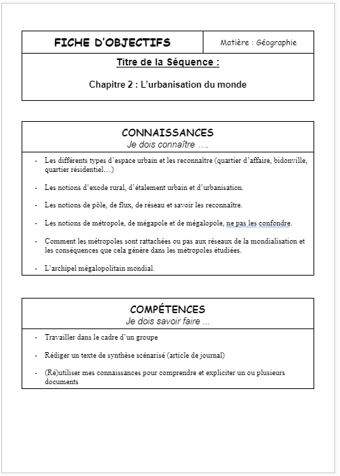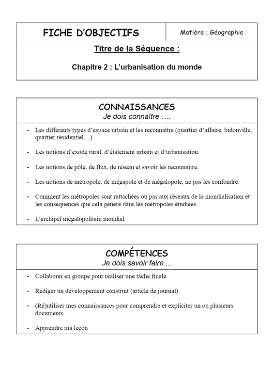 FICHE D’OBJECTIFS Matière : Géographie Titre de la Séquence : Chapitre 2 : L’urbanisation du monde CONNAISSANCES Je dois connaître …. Les différents types d’espace urbain et les reconnaître (quartier d’affaire, bidonville, quartier résidentiel…) Les notions d’exode rural, d’...