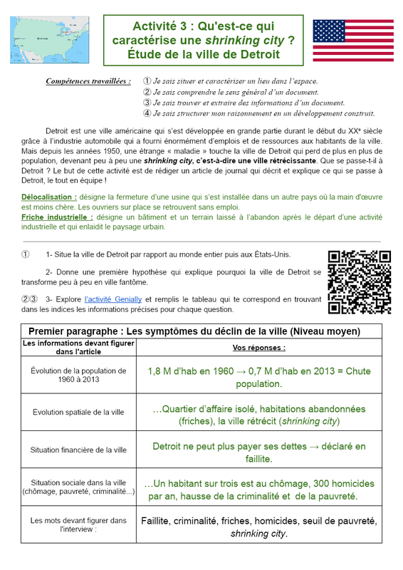 Activité 3 : Qu'est-ce qui caractérise une shrinking city ? Étude de la ville de Detroit Compétences travaillées : ➀ Je sais situer et caractériser un lieu dans l’espace. ➁ Je sais comprendre le sens général d’un document. ➂ Je sais trouver et extraire des informations d’un document. ➃ Je sais...