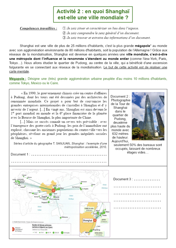 Activité 2 : en quoi Shanghaï est-elle une ville mondiale ? Compétences travaillées : ➀ Je sais situer et caractériser un lieu dans l’espace. ➁ Je sais comprendre le sens général d’un document. ➂ Je sais trouver et extraire des informations d’un document. Shanghai est une ville de plus de 25 m...