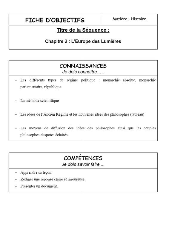 FICHE D’OBJECTIFS Matière : Histoire Titre de la Séquence : Chapitre 2 : L’Europe des Lumières CONNAISSANCES Je dois connaître …. Les différents types de régime politique : monarchie absolue, monarchie parlementaire, république. La méthode scientifique Les idées de l’Ancien...