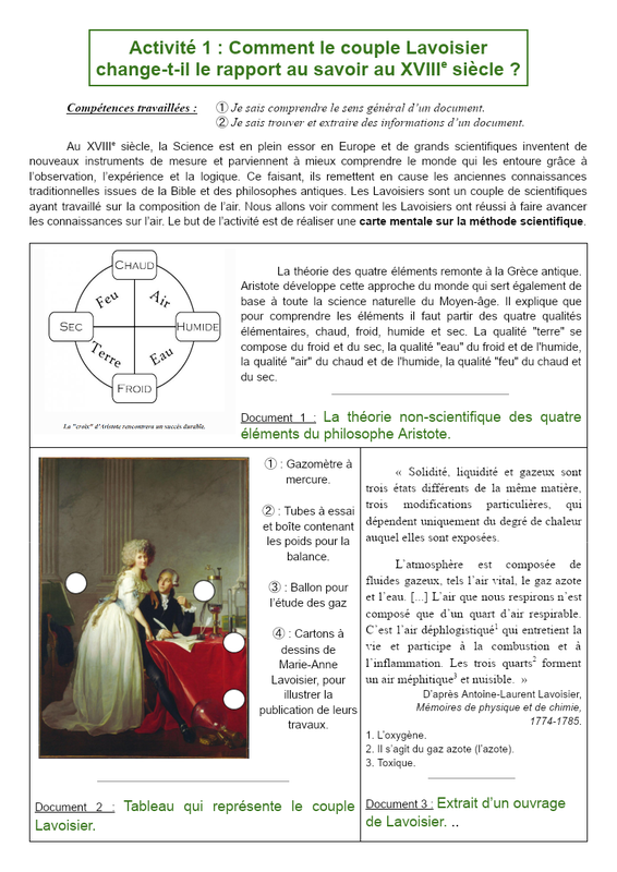 Activité 1 : Comment le couple Lavoisier change-t-il le rapport au savoir au XVIIIe siècle ? Compétences travaillées : ➀ Je sais comprendre le sens général d’un document. ➁ Je sais trouver et extraire des informations d’un document. Au XVIIIe siècle, la Science est en plein essor en Europe...