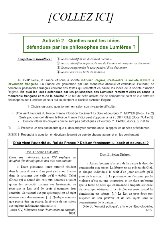 [COLLEZ ICI] Activité 2 : Quelles sont les idées défendues par les philosophes des Lumières ? Compétences travaillées : ➀ Je sais identifier un document inconnu. ➁ Je sais identifier le point de vue de l’auteur et critiquer un document. ➂ Je sais comprendre le sens général d’un document. ➃ J...