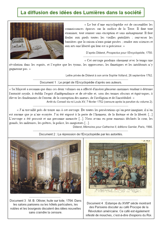 La diffusion des idées des Lumières dans la société « Le but d’une encyclopédie est de rassembler les connaissances éparses sur la surface de la Terre. Il faut tout examiner, tout remuer sans exception et sans ménagement. Il faut fouler aux pieds toutes les vieilles puérilités ; renverser les...