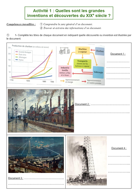 Activité 1 : Quelles sont les grandes inventions et découvertes du XIXe siècle ? Compétences travaillées : ➀ Comprendre le sens général d’un document. ➁ Trouver et extraire des informations d’un document. ➀ 1- Complète les titres de chaque document en indiquant quelle découverte ou invent...