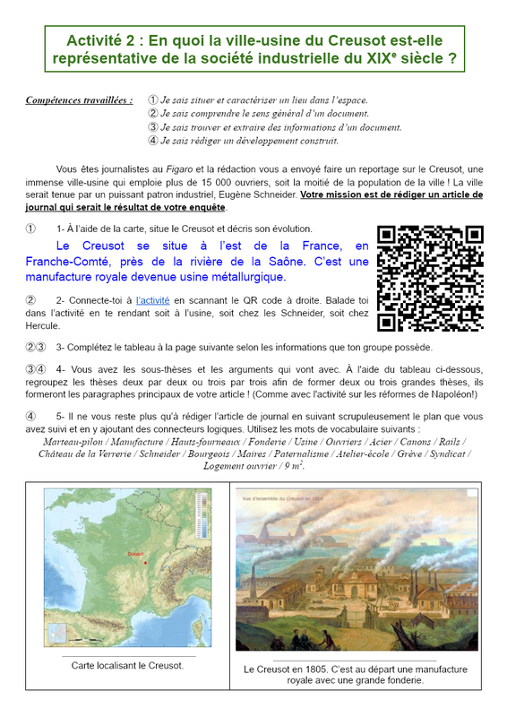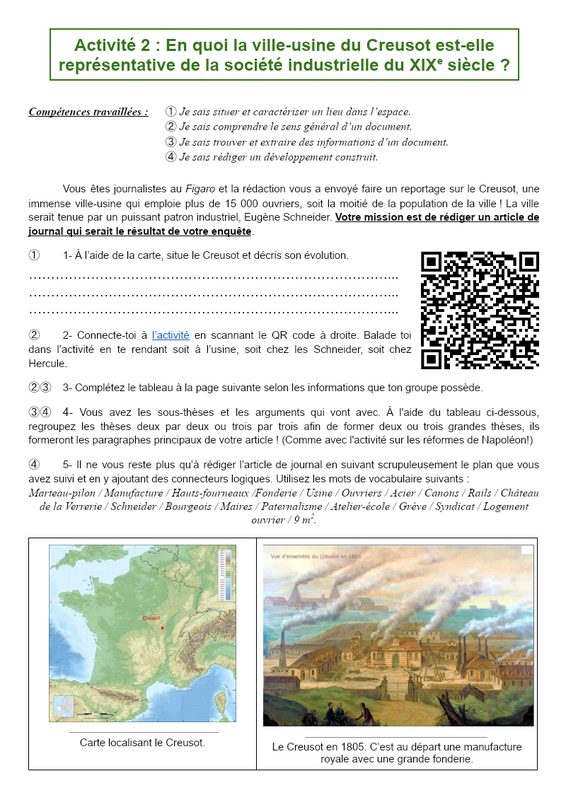 Activité 2 : En quoi la ville-usine du Creusot est-elle représentative de la société industrielle du XIXe siècle ? Compétences travaillées : ➀ Je sais situer et caractériser un lieu dans l’espace. ➁ Je sais comprendre le sens général d’un document. ➂ Je sais trouver et extraire des information...