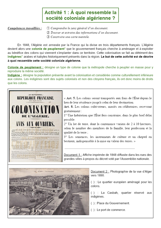 Activité 1 : À quoi ressemble la société coloniale algérienne ? Compétences travaillées : ➀ Comprendre le sens général d’un document. ➁ Trouver et extraire des informations d’un document. ➂ Construire une carte mentale. En 1848, l’Algérie est annexée par la France qui la divise en tr...