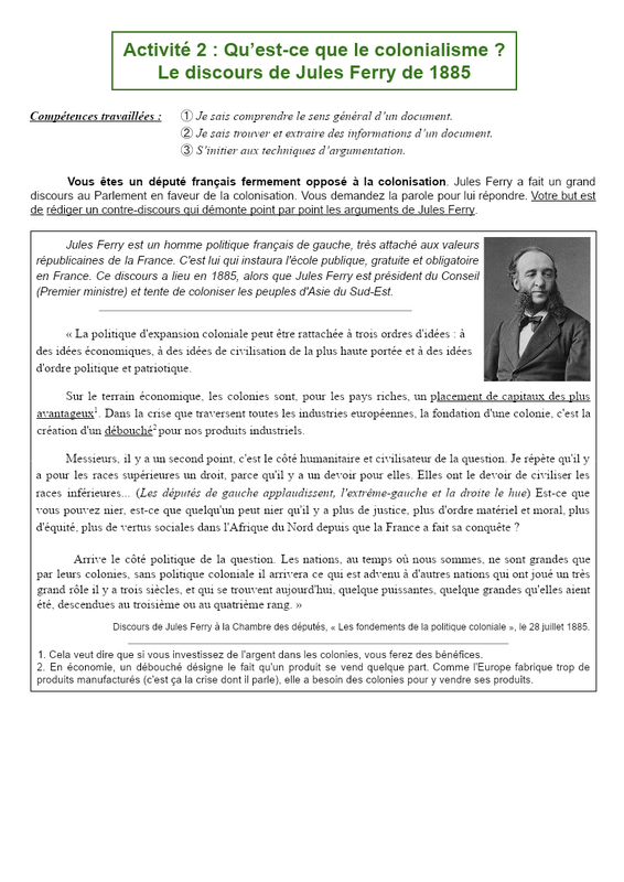 Activité 2 : Qu’est-ce que le colonialisme ? Le discours de Jules Ferry de 1885 Compétences travaillées : ➀ Je sais comprendre le sens général d’un document. ➁ Je sais trouver et extraire des informations d’un document. ➂ S’initier aux techniques d’argumentation. Vous êtes un député français fe...
