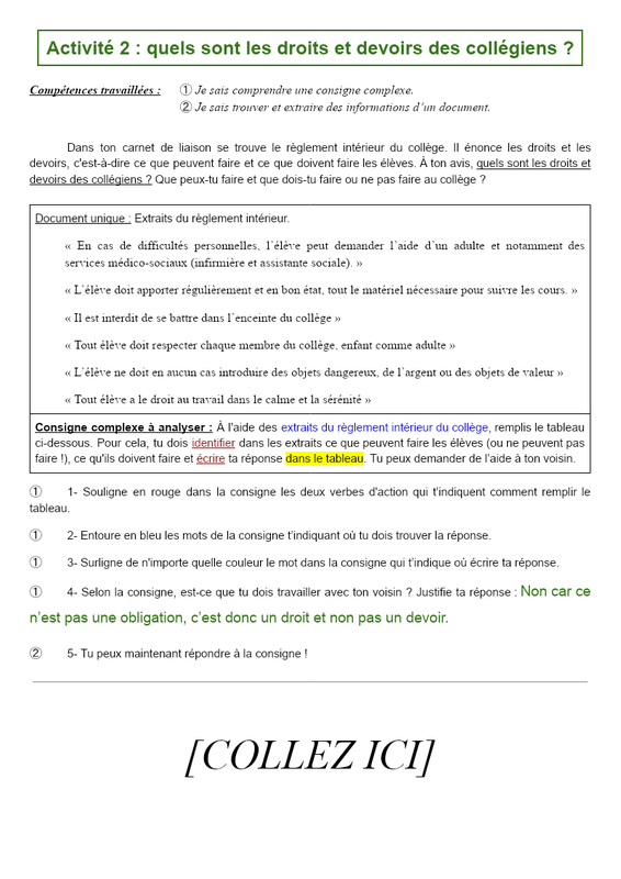 Activité 2 : quels sont les droits et devoirs des collégiens ? Compétences travaillées : ➀ Je sais comprendre une consigne complexe. ➁ Je sais trouver et extraire des informations d’un document. Dans ton carnet de liaison se trouve le règlement intérieur du collège. Il énonce les droits et les ...