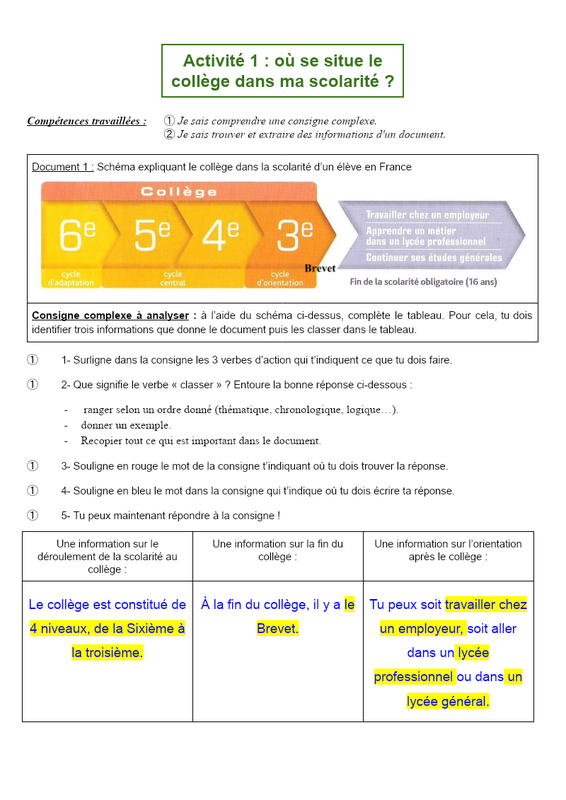 Activité 1 : où se situe le collège dans ma scolarité ? Compétences travaillées : ➀ Je sais comprendre une consigne complexe. ➁ Je sais trouver et extraire des informations d'un document. Document 1 : Schéma expliquant le collège dans la scolarité d’un élève en France Consigne complexe à...