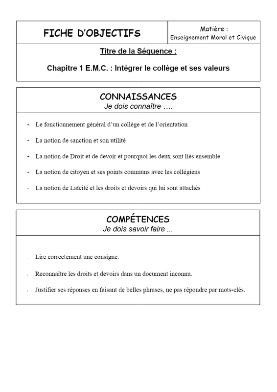 FICHE D’OBJECTIFS Matière : Enseignement Moral et Civique Titre de la Séquence : Chapitre 1 E.M.C. : Intégrer le collège et ses valeurs CONNAISSANCES Je dois connaître …. Le fonctionnement général d’un collège et de l’orientation La notion de sanction et son utilité La notion...