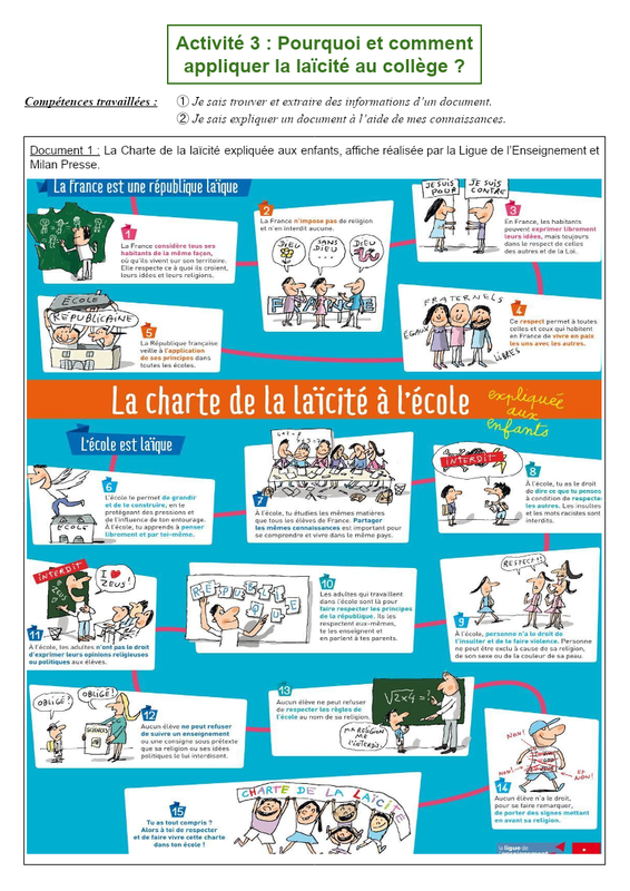 Activité 3 : Pourquoi et comment appliquer la laïcité au collège ? Compétences travaillées : ➀ Je sais trouver et extraire des informations d’un document. ➁ Je sais expliquer un document à l’aide de mes connaissances. Document 1 : La Charte de la laïcité expliquée aux enfants, affiche réali...